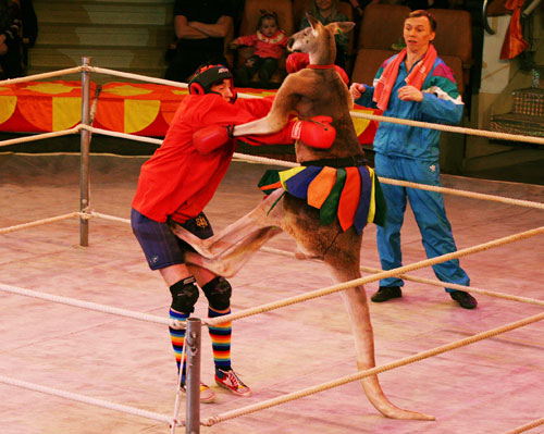 Вообще это очень сильные зверюги и вломить могут очень сильно, видел видео как они бьют и в новостях давно еще тоже. Турист вроде сфоткаться хотел с кенгуру и получил удар в челюсть, не помню уже с летальным исходом или только перелом был.